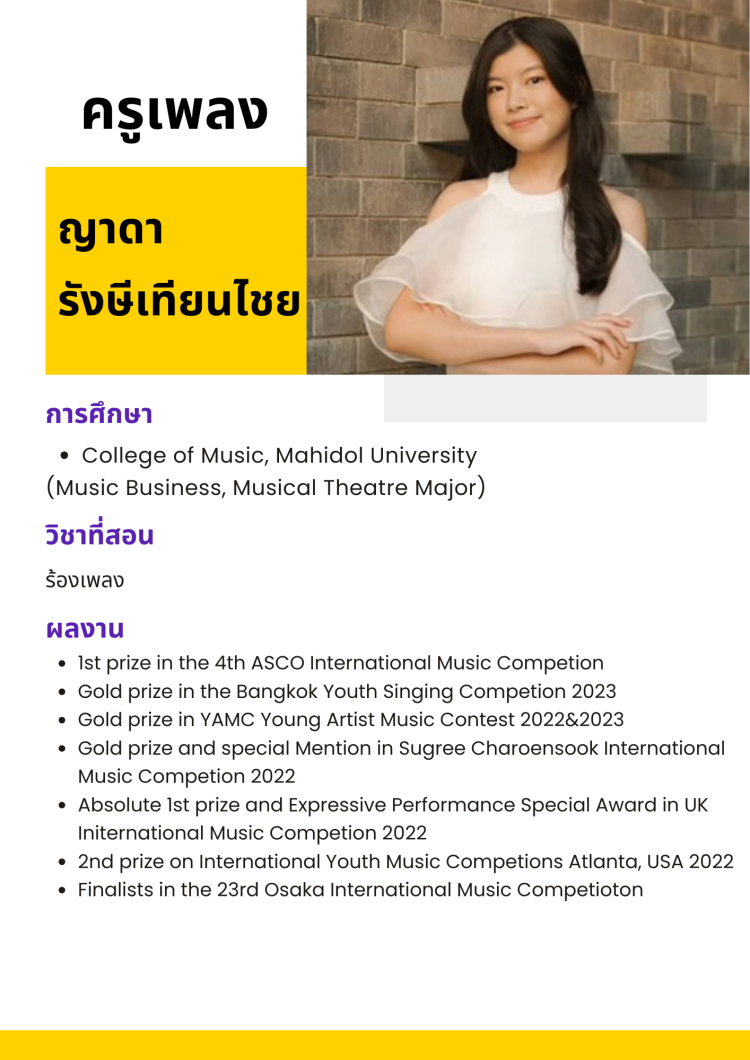 เรามุ่งเน้นการสอน ทฤษฎีดนตรี การขับร้อง และการแสดง อย่างเข้มข้น เพื่อช่วยให้ผู้เรียนสอบติดในสถาบันดนตรีชั้นนำทั้งในประเทศและต่างประเทศ พร้อมทั้งประสบความสำเร็จในสายงานดนตรี และ การแสดงในระดับสากล