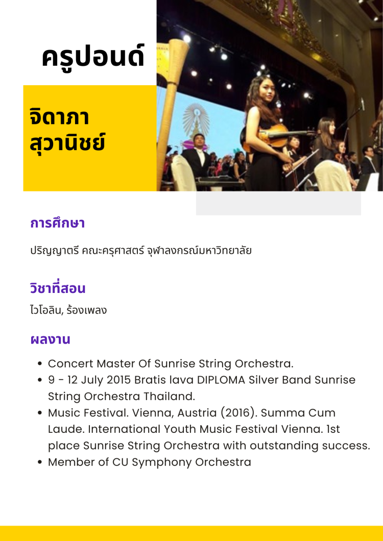 เป็นผู้นำด้านการพัฒนาบุคลิกภาพ ดนตรีและ Soft Skills ที่ครอบคลุมทุกช่วงวัยและองค์กร ด้วยการสร้างแรงบันดาลใจให้ทุกคน“ เป็นตัวคุณในเวอร์ชันที่ดีที่สุด” และเติบโตอย่างยั่งยืนในโลกที่เต็มไปด้วยความเปลี่ยนแปลง